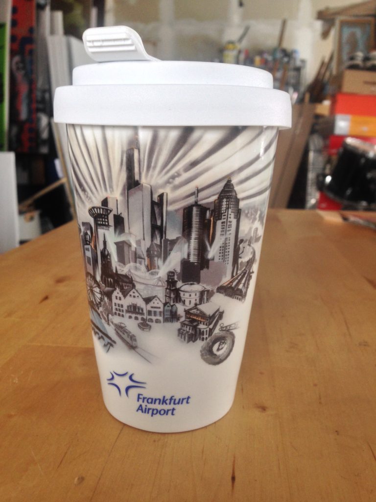 Since 2015, Fraport has been dealing a cup of the company Mahlwerck with my artwork as a special and limited gift, which I also sprayed on a bus station in the context of the 400 m graffiti art design in 2015 at the bus terminal 1 terminal at Frankfurt International Airport. The motif consists of a collection of Frankfurt bookmarks, such as Waldstadion, Dippemess‘, Römer, iron pier, Paulskirche, Alte Oper, Hauptbahnhof, Hammering Man, Dom and Goetheturm in front of the Frankfurt skyscraper skyline.