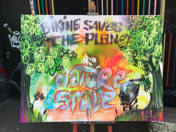 finished Bomber Artwork Biking saves the planet, 160 x 120 cm, Sprühdose und acryl auf Leinwand, Spraycan on canvas