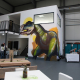 What started as a street art airbrushing event for the inauguration of the new location in Idstein in 2015 (thanx to Evendon / Beate Hüls) also got a bold wall design in the form of a freehand sprayed Tyrannosaurus Rex, about 7 m high and about 8 m wide, also created by me with a can.