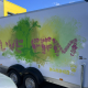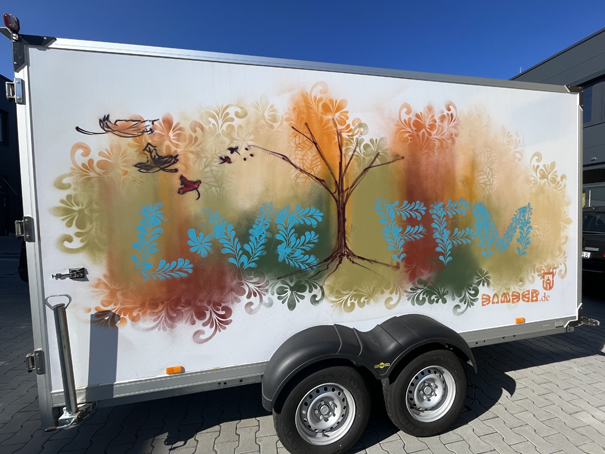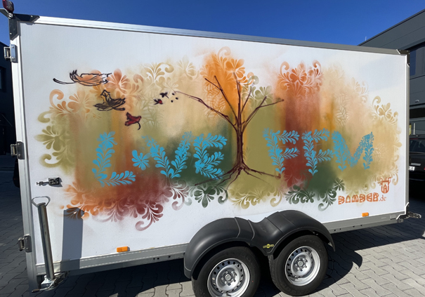 Im April 2023 gestaltete bzw. besprühte ich freestyle und spontan einen Anhänger mit einer Ästhetik, die bisher einzigartig ist. Ich ließ schon vor einiger Zeit davor die berühmt berüchtigten Bembel-Salzglasurschwünge als Schablone erstellen und nutzte sie hierbei nicht nur als Muster für den Hintergrund meiner Graffiti Art- / Street Art-Motive, sondern gestaltete daraus auch gleich einen Font bzw. eine Typografie bzw. ein Lettering um daraus die Headline für den Hänger zu generieren: LOVE FFM (Frankfurt am Main). Jede Seite bekam ein individuelle Gestaltung die der jeweiligen Jahrezeit entspricht: Frühling (Trieb aus abgesägtem Baumstumpf), Sommer (inkl. Quitschente und Schwimmreifen, Sonnenschirm), Herbst (fliegende Blätter), Winter (Schneemann).
